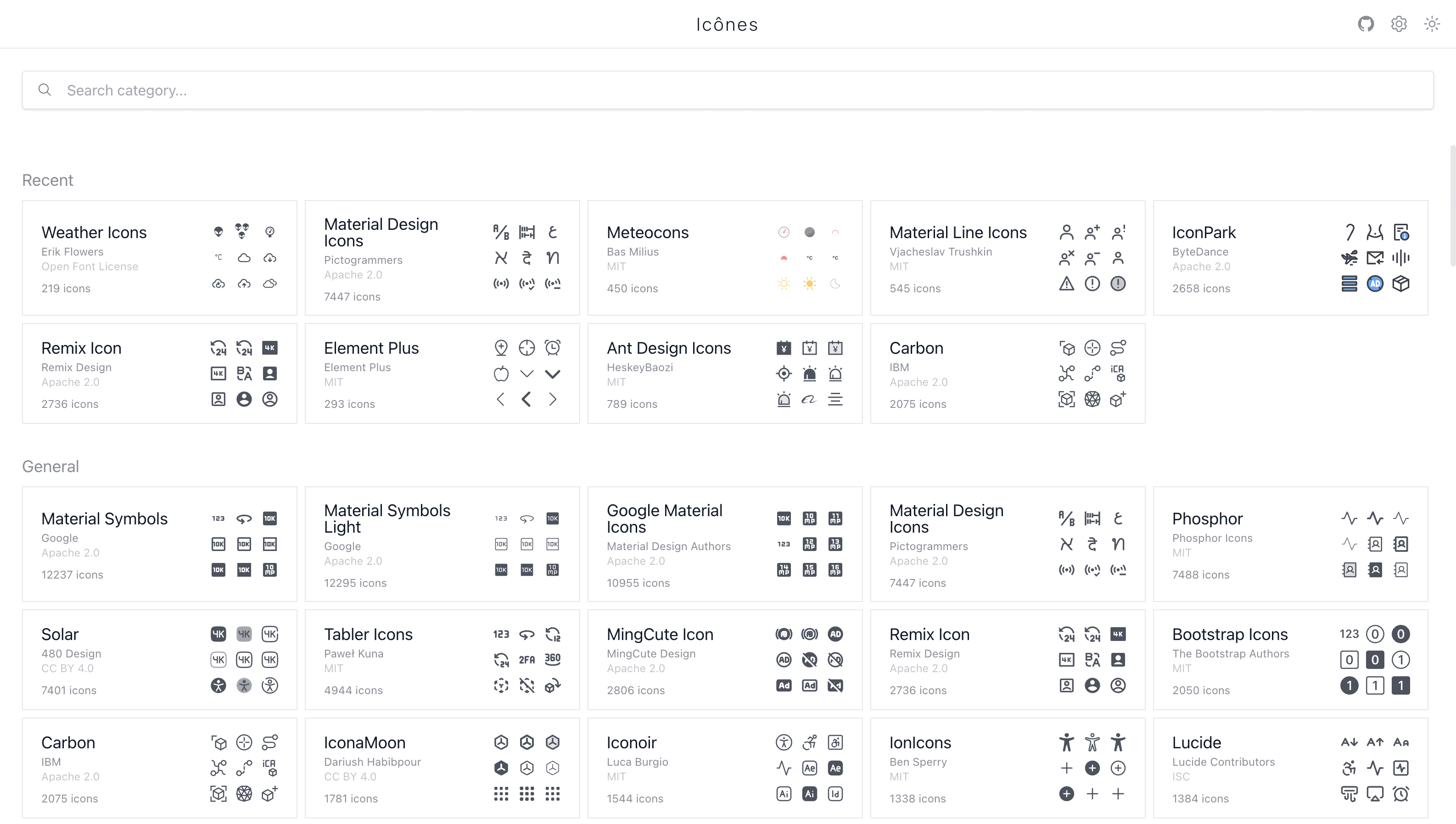 除了可以在 Iconify 官网上查找搜需要的图标,你还可以在 Icônes 网站 上查找,这是一个基于 Iconify 的在线图标搜索网站,它比 Iconify 官网的操作更直观。