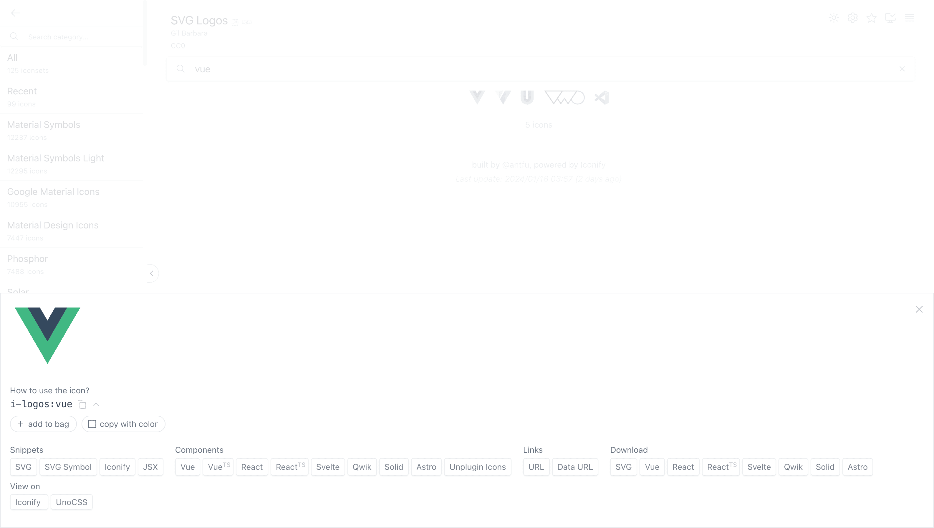 框架已经做好了所有配置,使用方式也极为简单,你只需进入 Iconify 官网 上查找 Iconify 提供的所有图标,然后点击需要使用的图标,复制图标名称,在任意原生 HTML 标签上通过设置 class ,格式为 i-{集合名}:{图标名},例如: